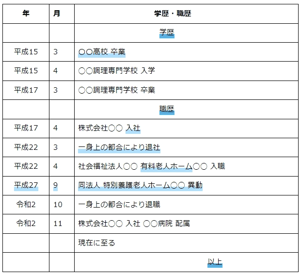 「社会福祉法人」「医療法人」などで就業した場合⇒「入職」「退職」揃えて記入しましょう。 - 最後に「以上」をつける