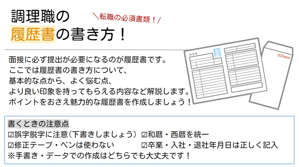 経験者:ホテルでの和食調理を約5年ほど経験してきました。今までの経験を活かしながら、貴社の料理を謙虚に学び、より料理人としてスキルアップしていきたいと考えております。